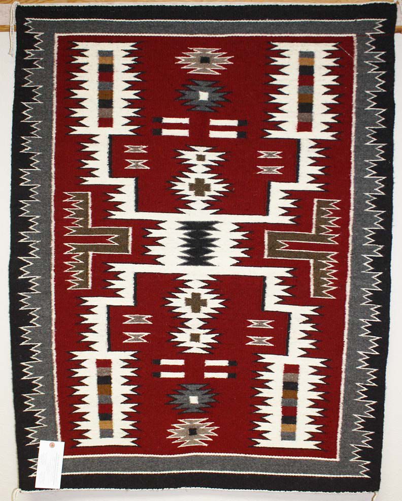 The main feature of this type is the central X or H pattern found in the center of the rug. The rug itself can be made using any color combination and or any type of wool yarn. This includes handspun single ply, commercial one ply, and multi-ply yarns. There are many stories as to what this X or H means. I have heard it represent lightning, the four sacred mountains, the four directions. As with most Navajo rugs, the patterns have no hidden meaning.