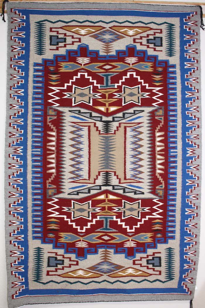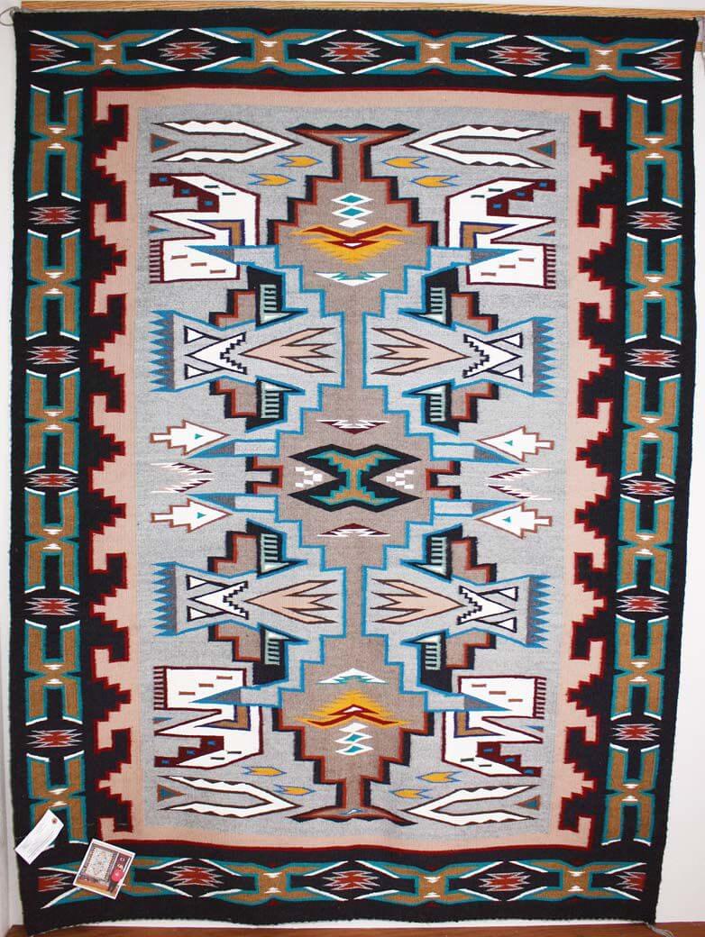 Teec Nos Pos rugs in the classic style of Navajo rugs usually have a decorated border. The center pattern is any geometric design other than a diamond as in a Two Grey Hills or Ganado Red rug. The yarns used can be hand spun or commercially produced or a combination of both. Hand spun yarns are normally a single ply. Commercial yarns used are 1,2,3,or made with 4 plys. It is the played yarns that give this rug type it’s long wearing strength. Usually Teec Nos Pos rugs have a lot of color. Although color can be had using natural wool or vegetal dyes, most weavers use aniline dyes which will hold its color longer over time and use.